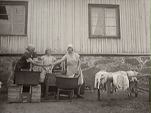 Klädvård. Tvättning av kläder utomhus på Hallagård. Kvinnorna som tvättar är fr v Ebba Larsson, Alice Andersson och Ebba Stener. Se E7136, foto från samma tillfälle.