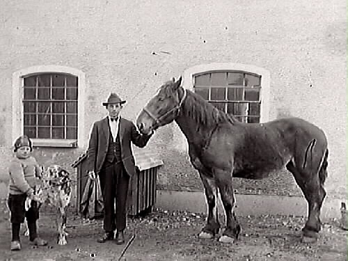 Daniel Karlsson visar fram en häst och gossen Sture Nilsson står intill och håller upp tassen på en hund. Bakom dem ses hundkojan. De är fotograferade framför en ladugårdsvägg på Karl Nilssons gård.