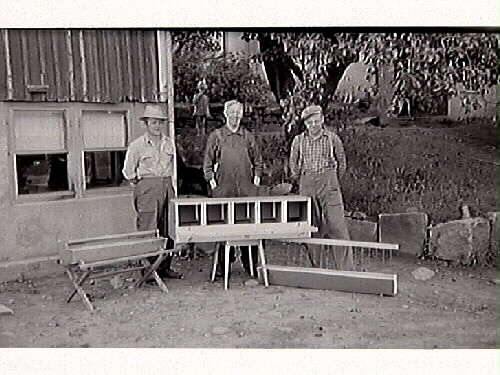 Tillverkning av värpreden och foderbord för höns. Personerna på bilden fr v Bertil Heimroth, Axel Johansson och Tufve Johansson. Flickan i bakgrunden heter Laila Åkerberg. Fototid ca 1950.