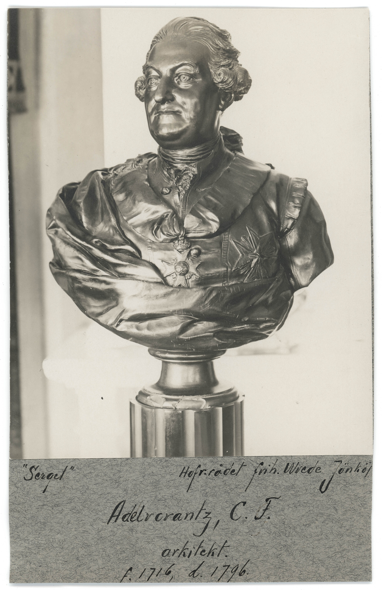 Porträtt, Bild på en Gipsbyst som föreställer Carl Fredric Adelcrantz. Signerad Trångsund Sergelll.