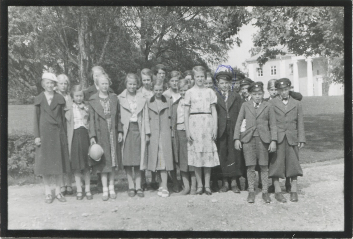 Elever och läraren Gunnar Alander från Kållered är på skolresa, 1930-tal. Eleverna är födda omkring 1924 - 25.