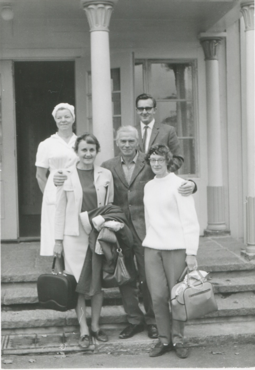 Lägerskola för skolelever, Ransbergs Herrgård i Värmland 1965. Personalen står samlad på trappan utanför herrgården. Från vänster: 1. Kokerska. 2. Sonja Andersson, lärare från Kållered. 3. Vaktmästare. 4. Gunnar Hillerström, rektor i Kållered. 5. Winnie Lundström, förälder (skolmatsalsarbetare i Kållered).