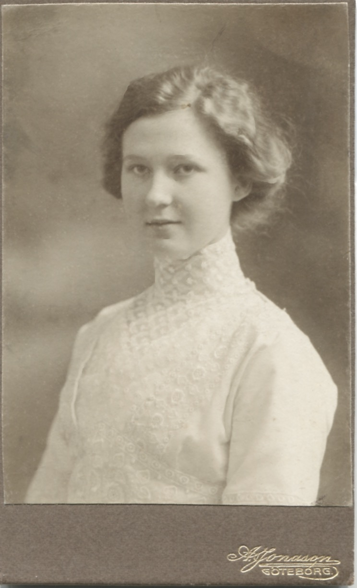 Ateljéporträtt av Svea Henning (född 1895, uppväxt i Göteborg), okänt årtal. Dotter till Amanda Börjesson, Alegårdsslätt F2 och Henning Andersson, Göteborg. Bilden kommer från Svea Johanssons album. Kvinnorna var kusiner.