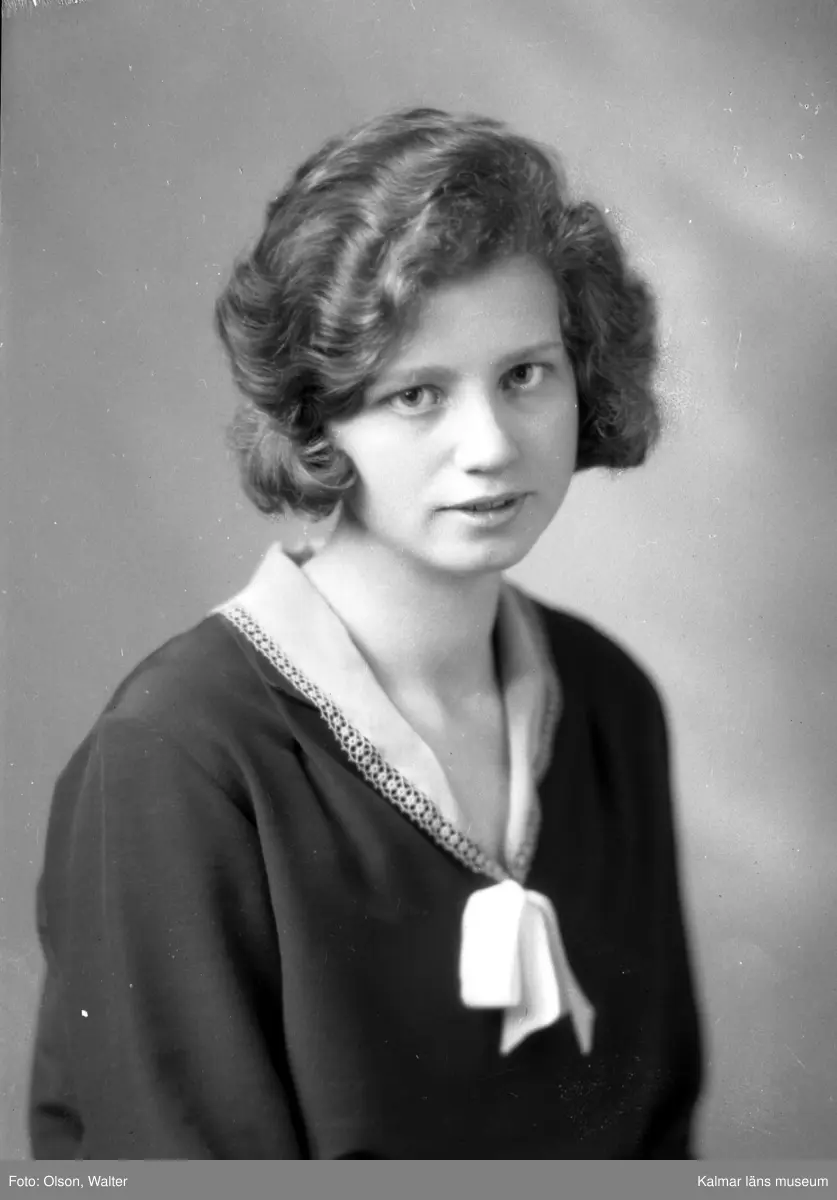 Ateljébild på en kvinna med rosett. Enligt Walter Olsons journal är bilden beställd av Elna Pettersson.