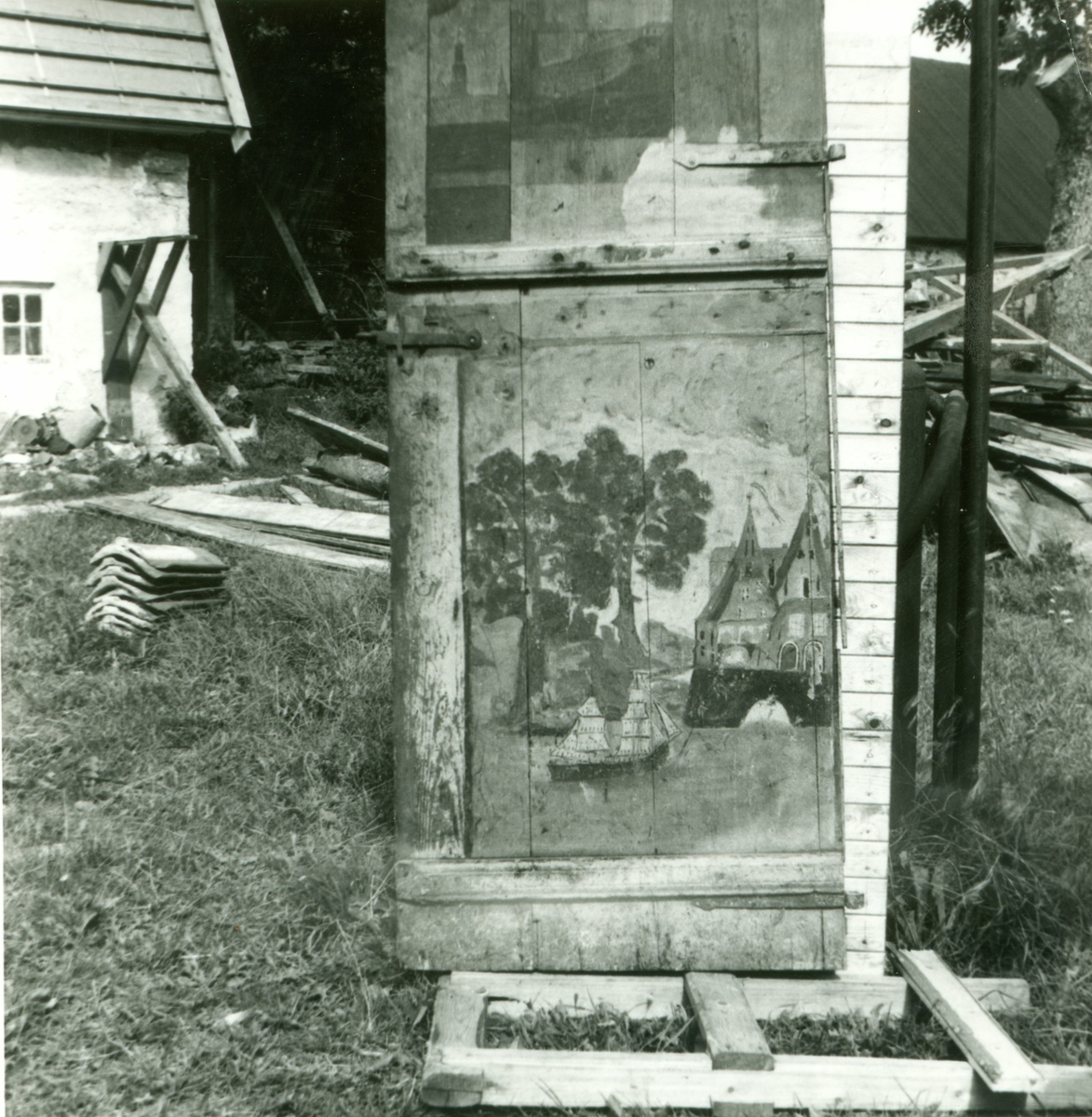 Titel: Dörr med målad dekor, hittad i flygeln vid gårdens restaurering 1954.