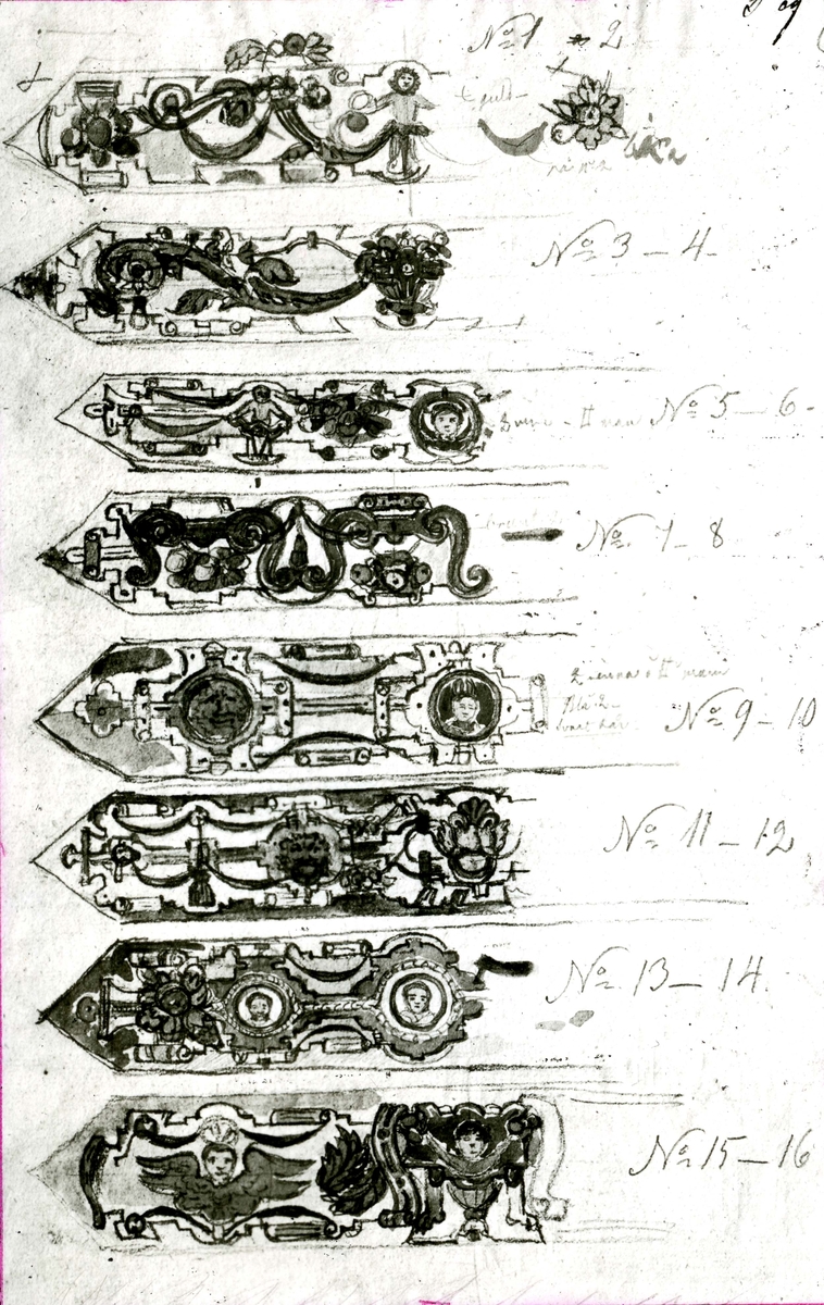Titel: Gyllene salen på Kalmar slott. Skisser av Nils Månsson Mandelgren 1848. På vissa plåtar har Martin Olsson klistrat eltejp för att markera hur bilden skulle beskäras i boken.