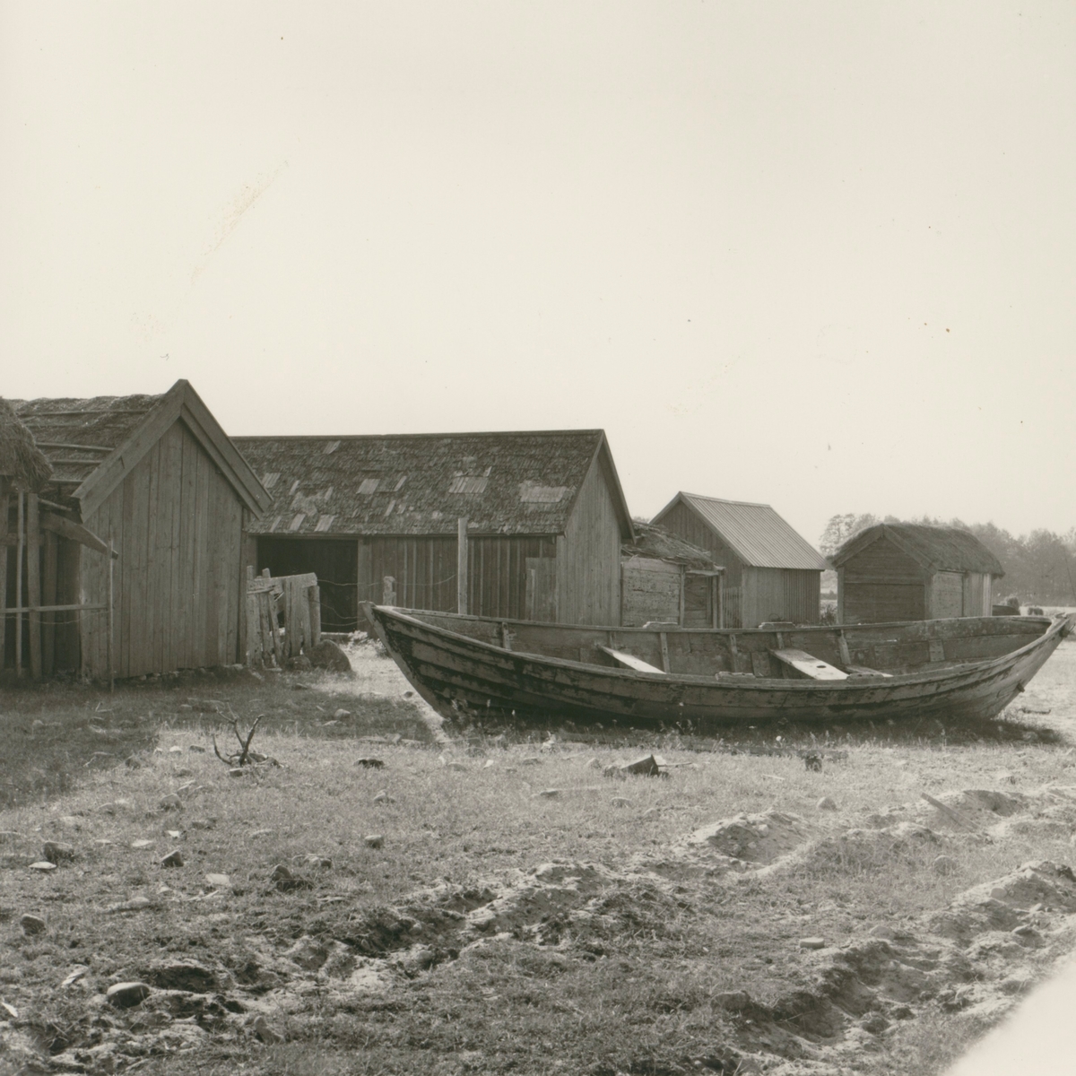 Sjöbodar och en fiskebåt i Alvara.