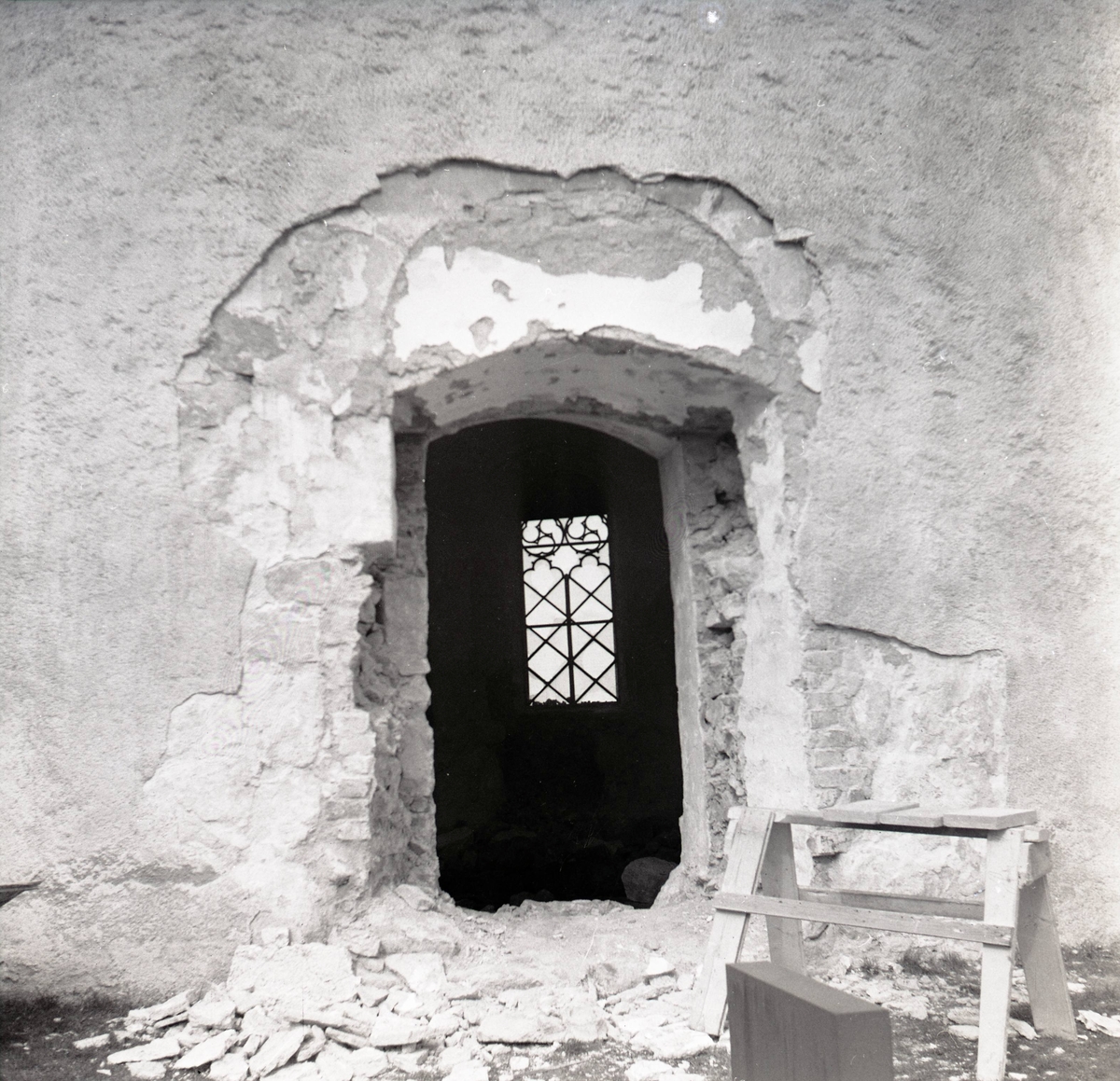 En portal i Voxtorp kyrka, med rasmassor framför.