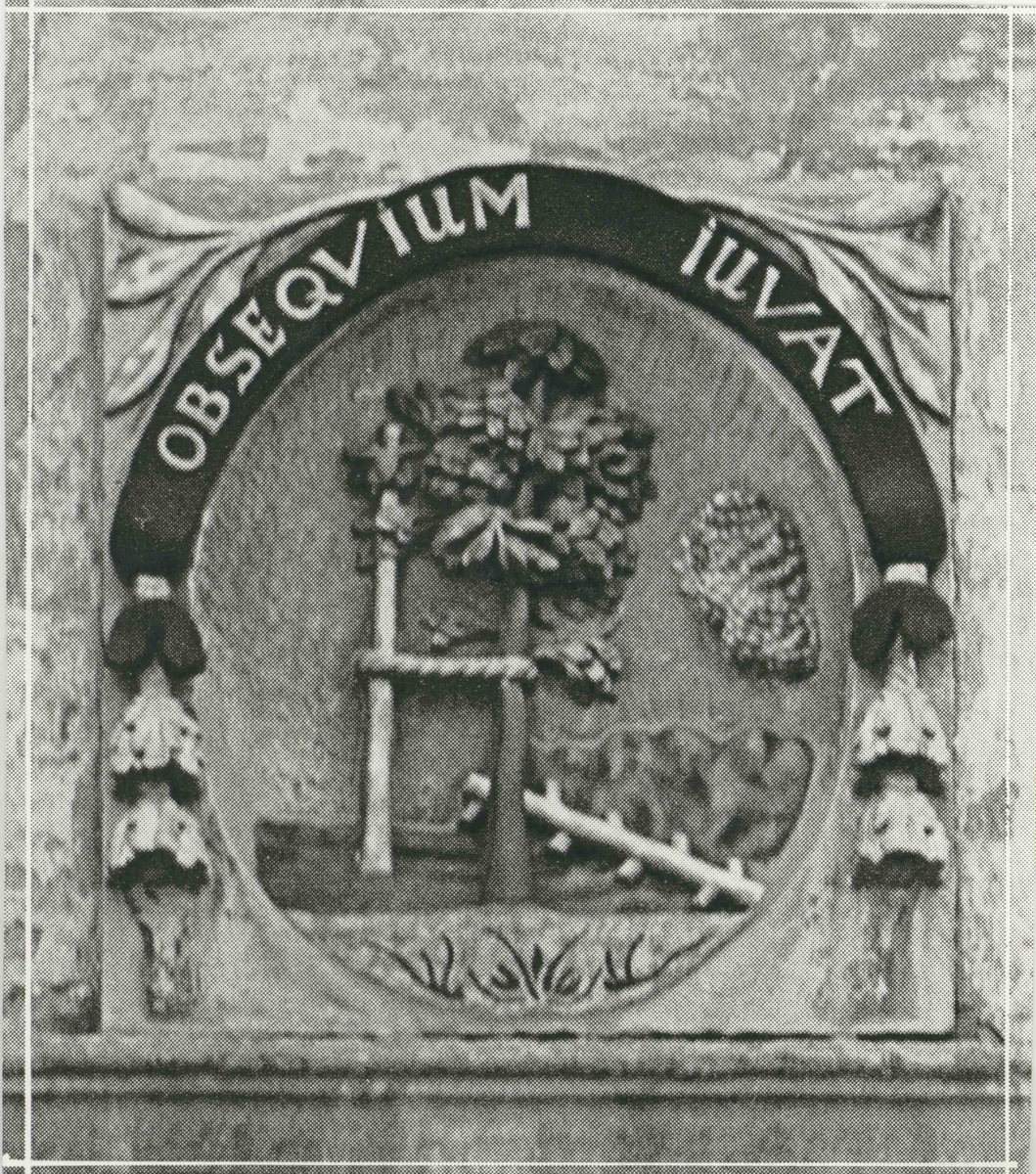 Stenrelief på rådhusets huvudfasad, huggen av Jakob Schultz och uppsatt 1688. Obseqvium iuvat betyder foglighet/lydnad räddar/hjälper.