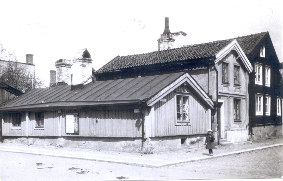 Foto från tidigt 1900-tal av Tripp-trapp-trull, tre små hus som bevarats på västra Kvarnholmen där annars merparten av bebyggelsen är sentida.