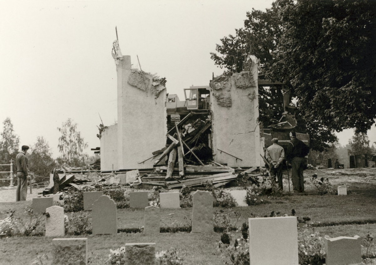 Hälleberga kyrka: Kyrkan brann ner 1976-10-18. Branden orsakades av ett elfel.