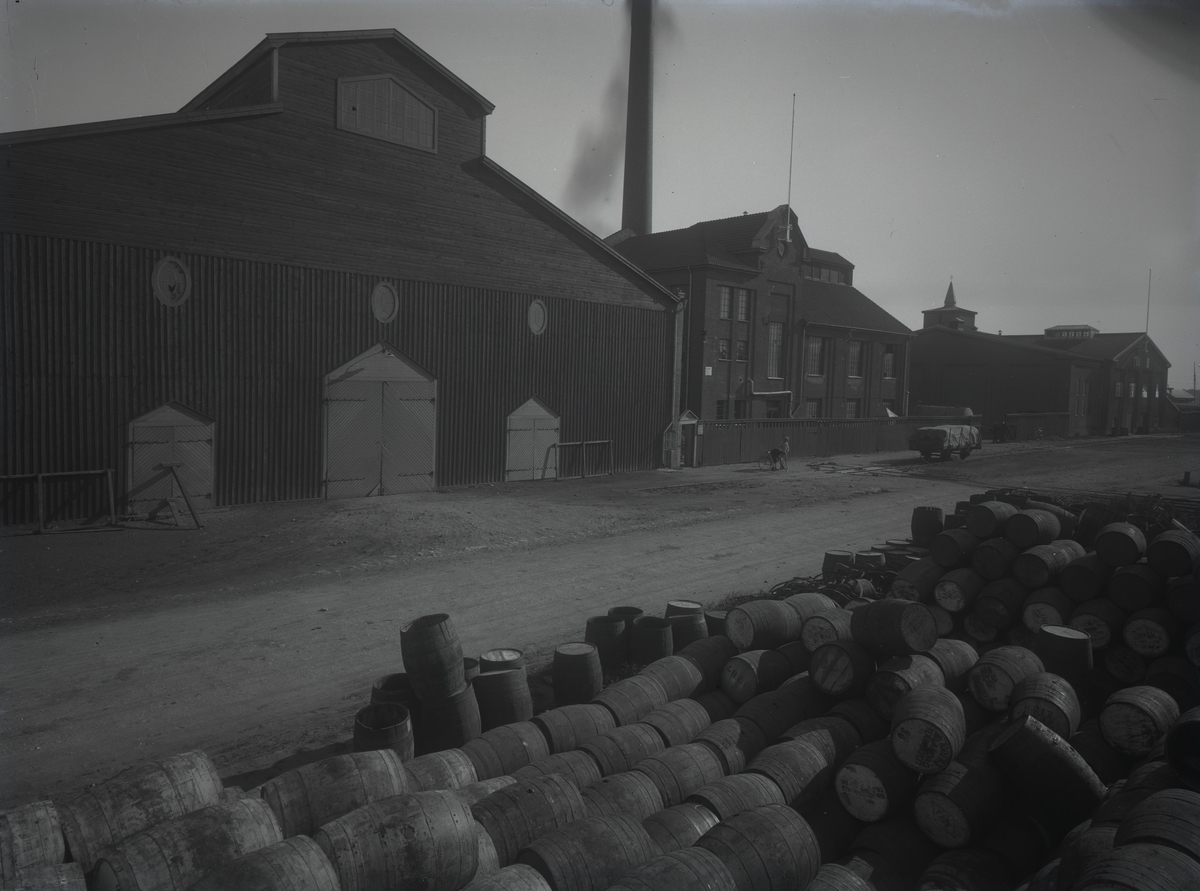 Titel: Fabriksbyggnader och upplag av tunnor på Barlastholmen.