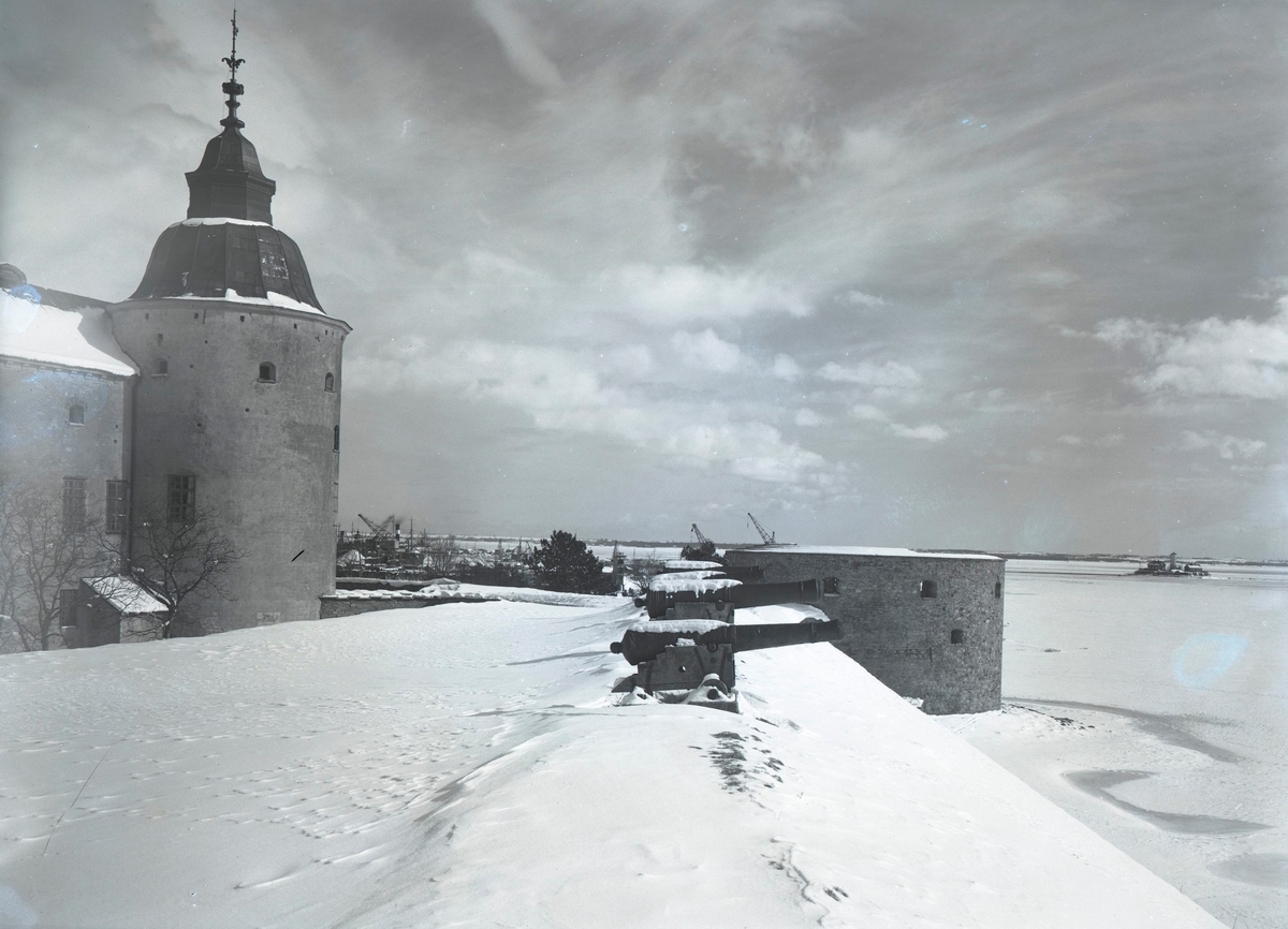 Vy slottet i snö fasad från postejen med Grimskär i bakgrunden.