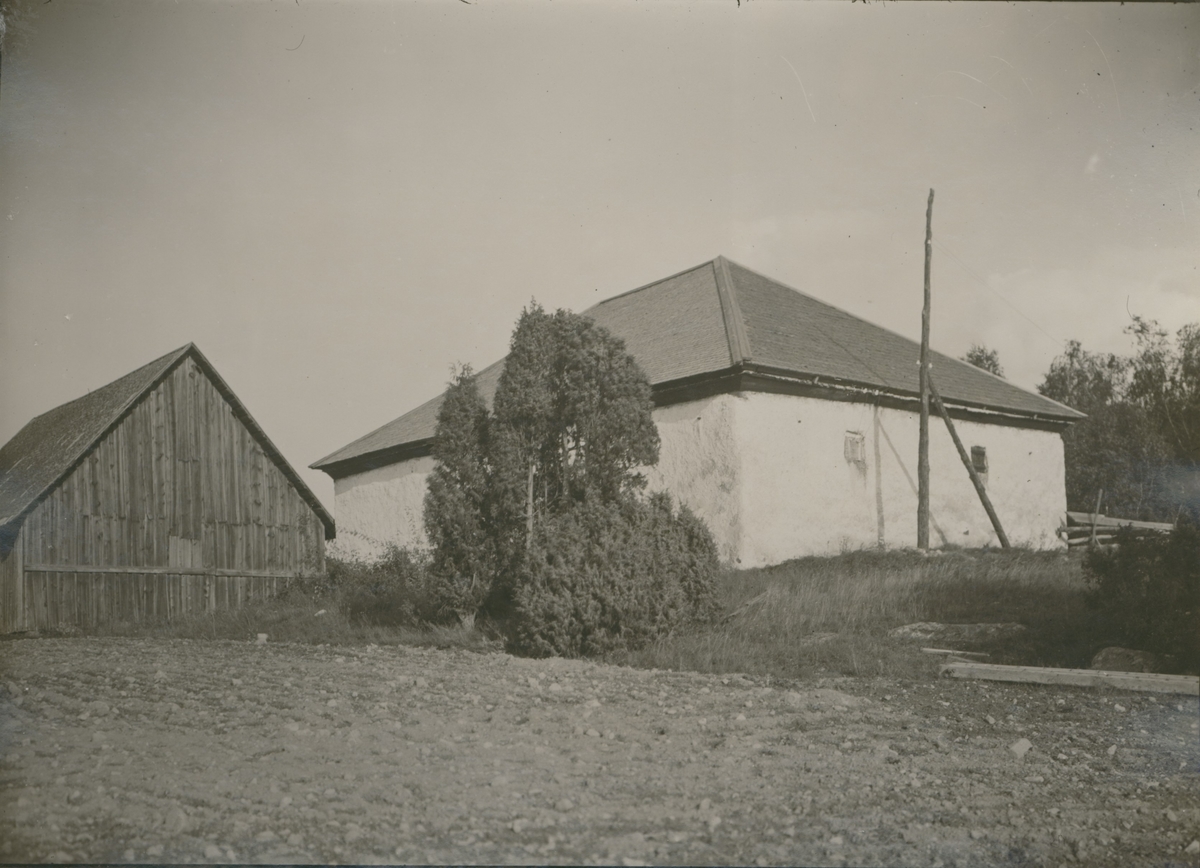 Två ekonomibyggnader med träfasad och putsad fasad i Fliseryd.