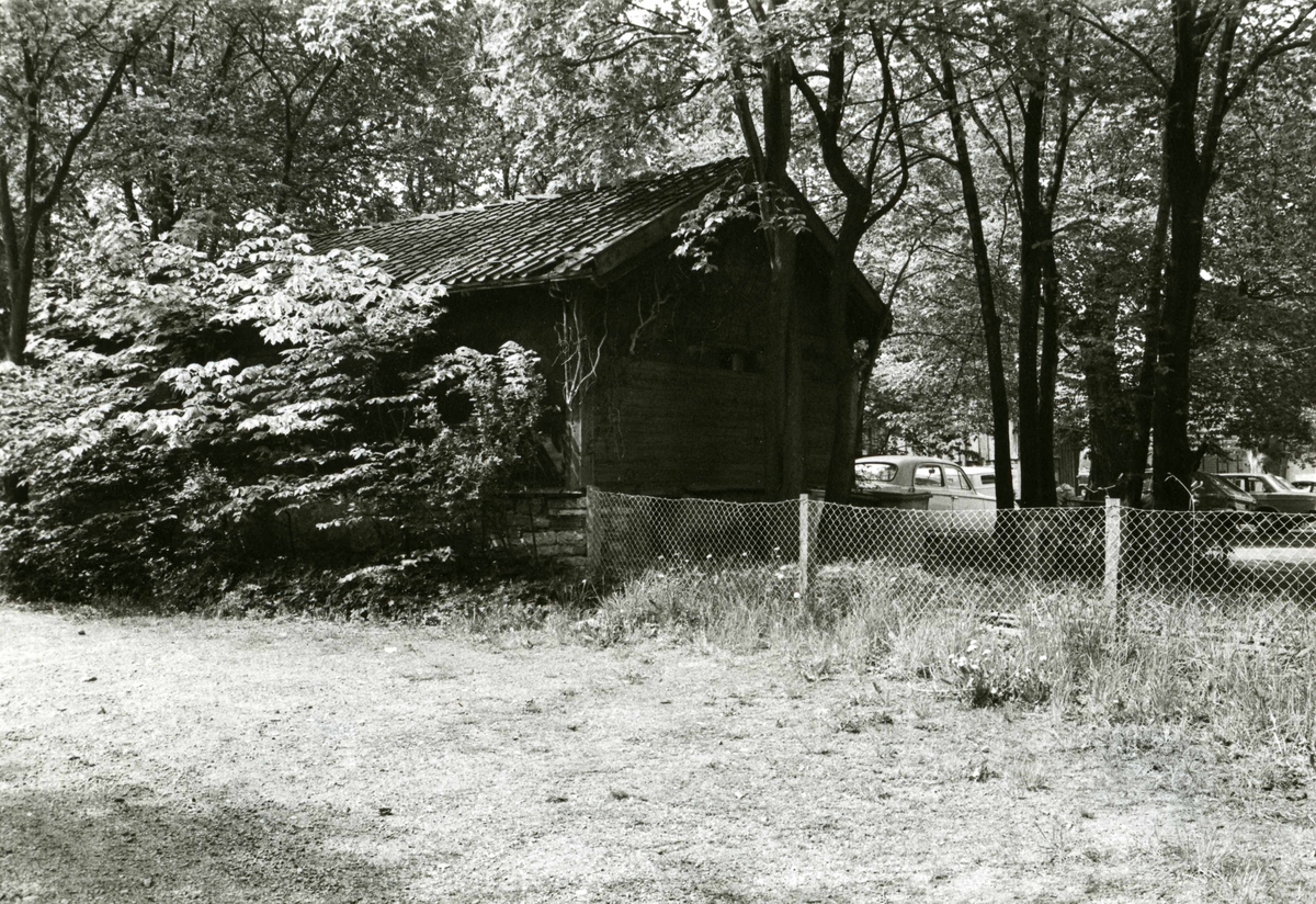 En ekonomibyggnad med timmerfasad i kvarter Häggen nummer 2.