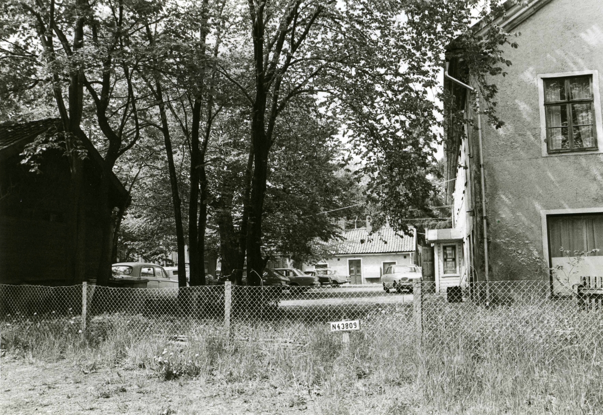 Kvarter Häggen nummer 2 och nummer 3 i Kalmar. Ekonomibyggnad, staket, träd och bostadshus.