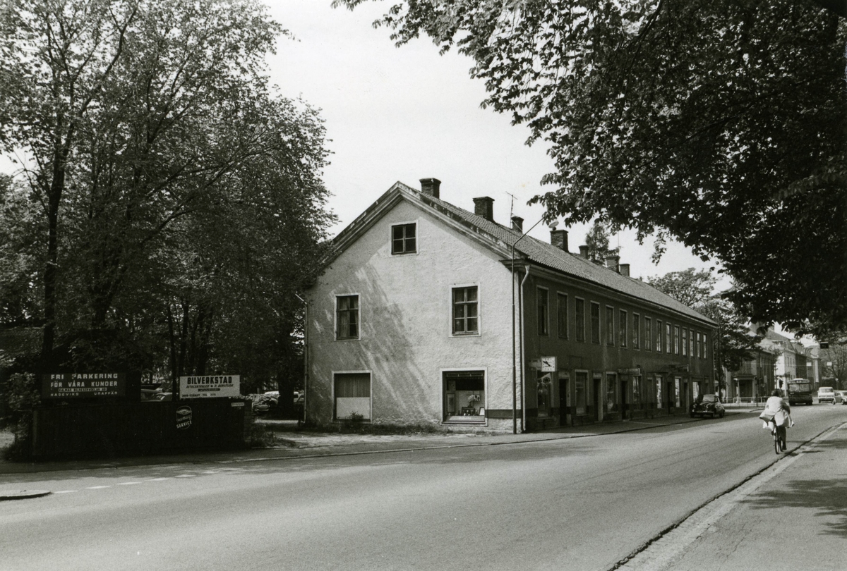 Bostadshus i putsad fasad med affärer i kvarter Häggen nummer 3.