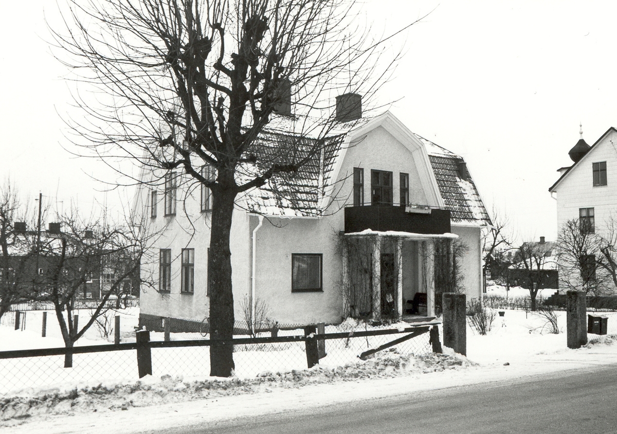 Ett bostadshus i putsad fasad, med balkong och veranda.