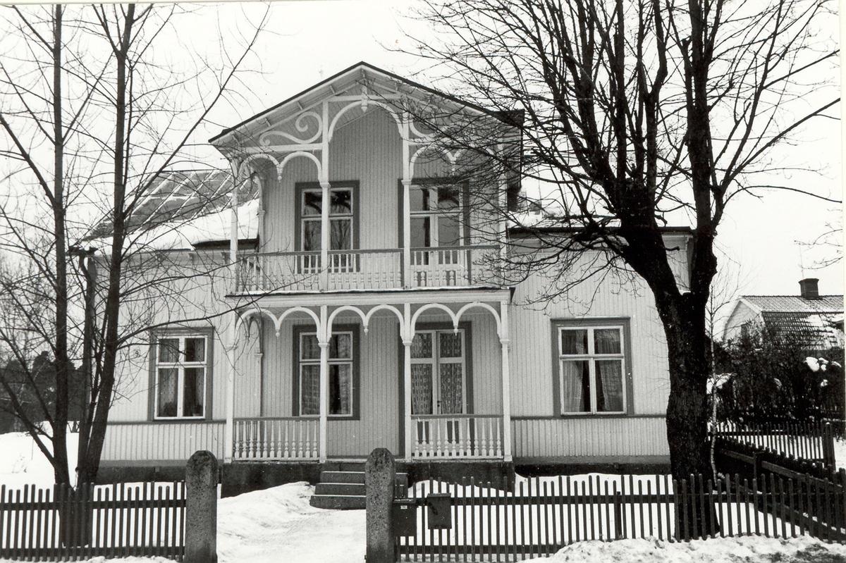 Fastighet 1:65 med träfasad, balkong och veranda.
