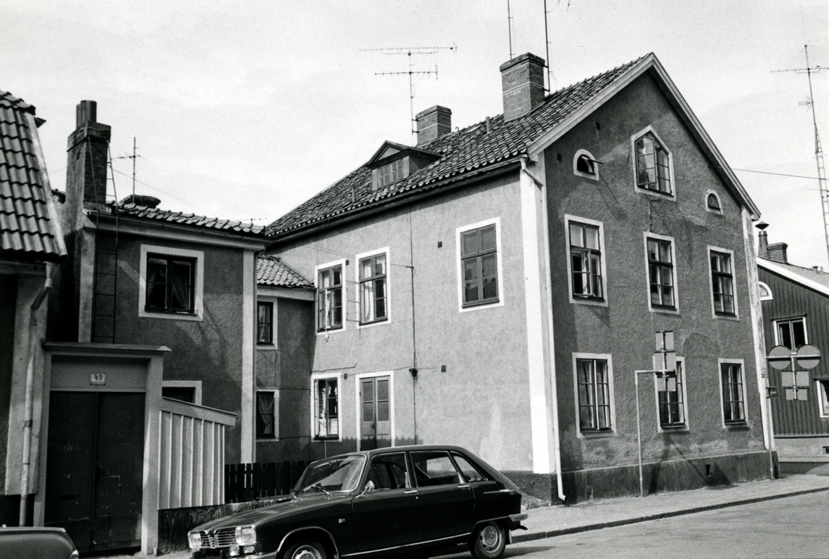 Bostadshus och en bil av märket Renault 16 på Storgatan i Kalmar.