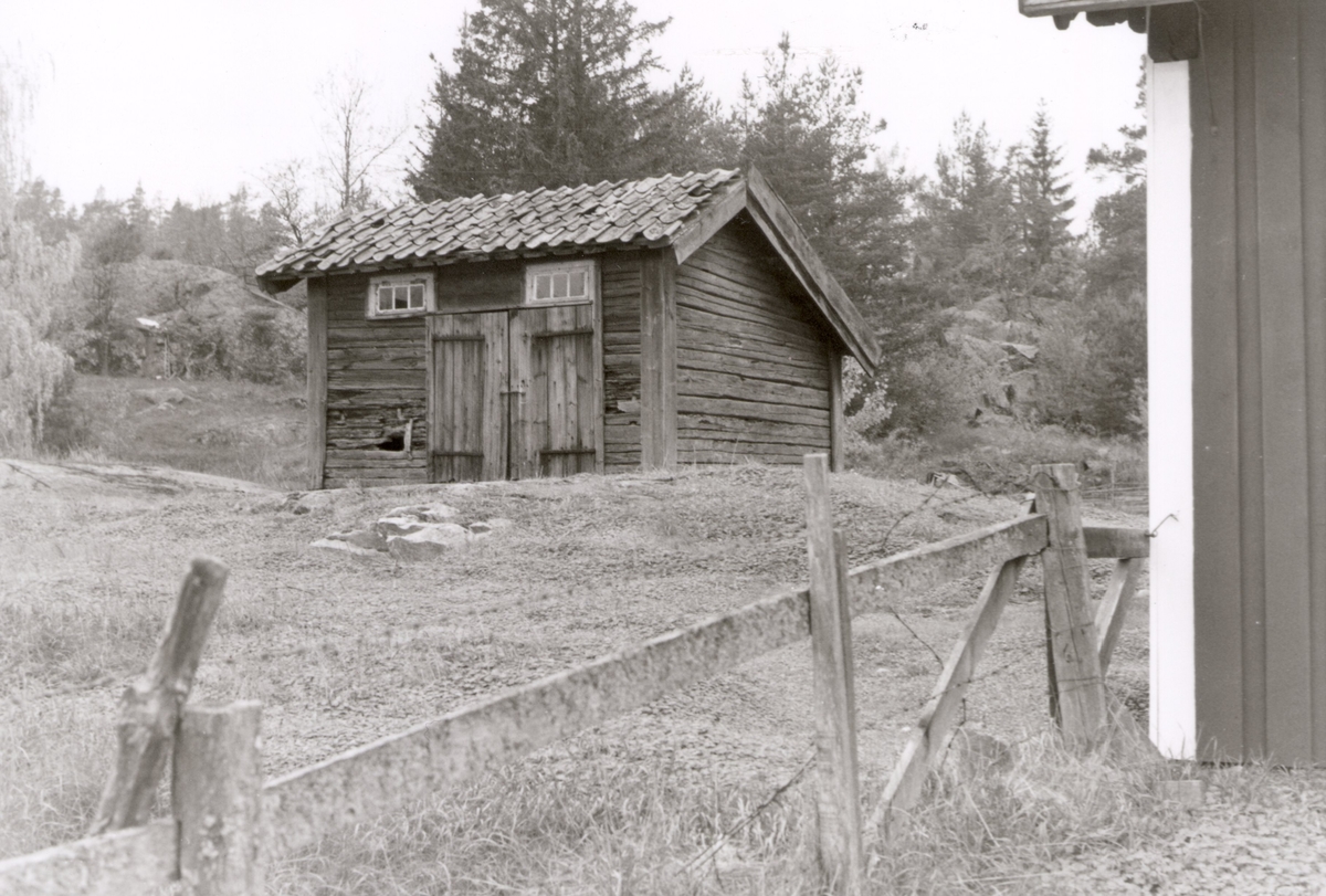 Ett uthus med träfasad vid hembygdsgården i Lofta.