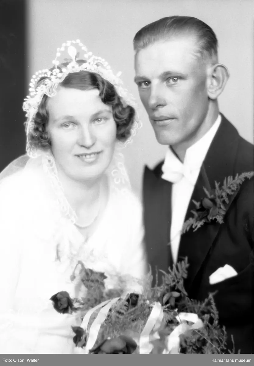 Bröllopsbild. Kvinnan har tiara, brudslöja och blommor. Beställare till bilden: Göte Johansson.