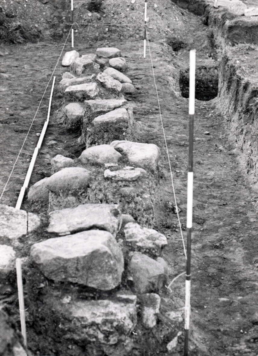 Utgrävning på Kalmar slott. Mellersta stenraden sedd mot norr Rapporten: Krutkammaren, vallgraven, västra vallen och brunnar.