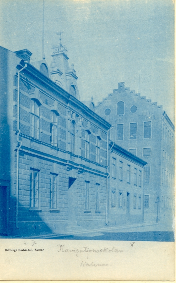 Titel: Fr.v navigations skolan byggd 1869-70 i en våning påbyggd till två våningar 1899. Huset till höger lokal för navigationsskolan 1841-70.