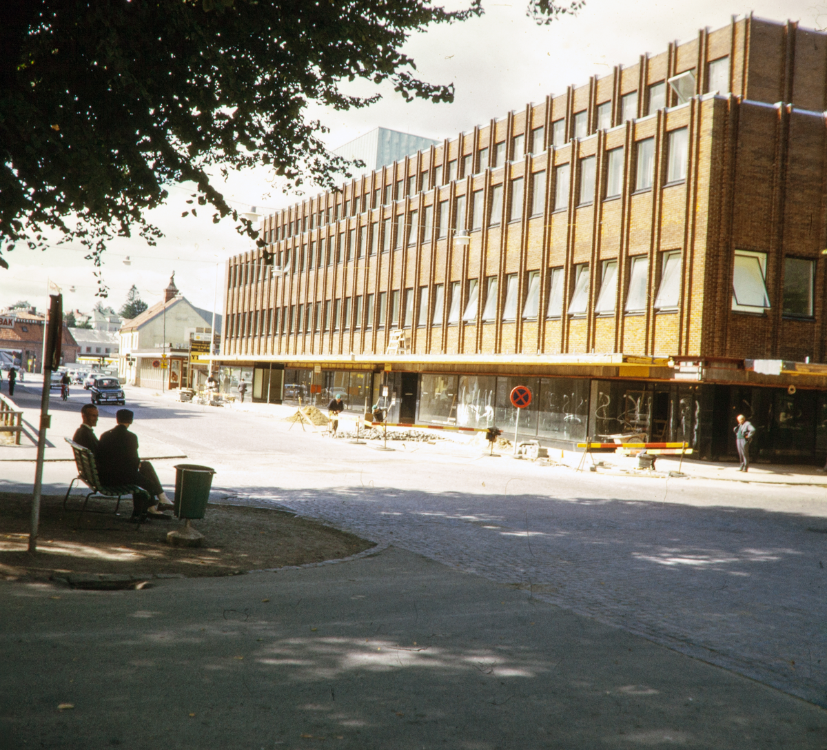 Storgatan, Växjö, i korsningen mot Västra Esplanaden. Till höger syns det nya Valandhuset i kvarteret Tegnér. Man håller på att reparera stensättningen i gatan.