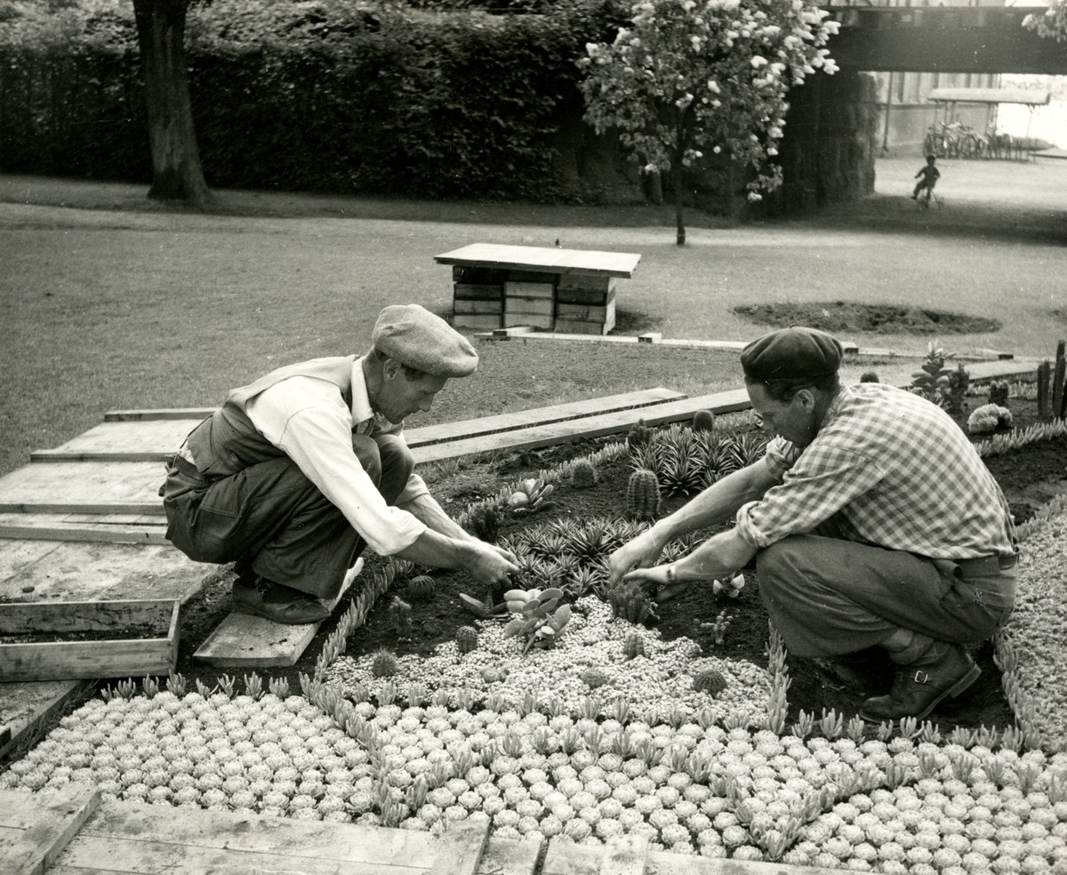Några parkarbetare håller på med kaktusrabatten vid Carl von Linnés byst i Linnéparken.