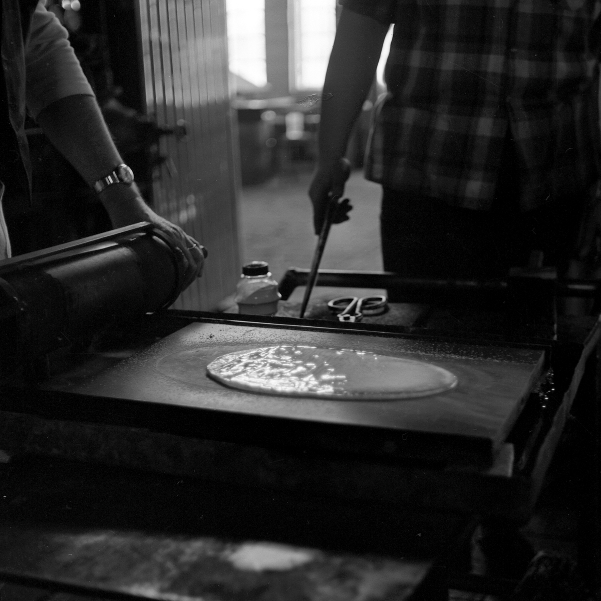 Tillverkning av glasfönster på Gullaskrufs glasbruk. Konstnären Bo Beskow plattar det varma glaset med en järnkavel.