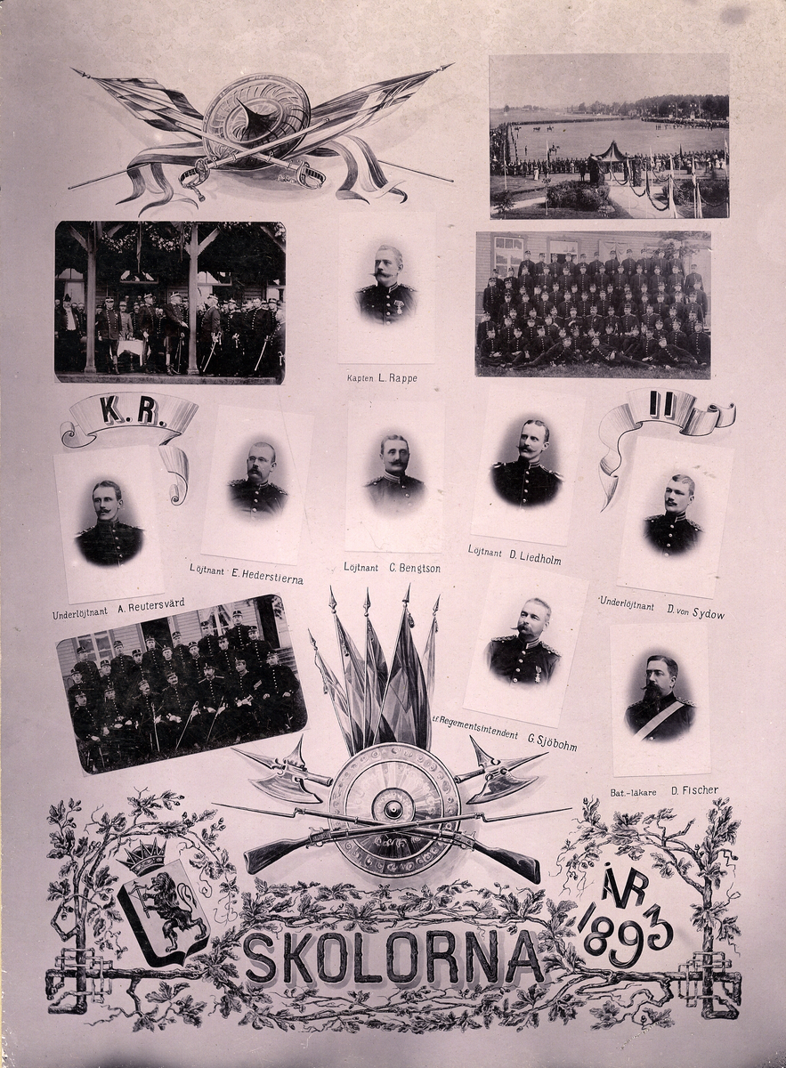 Ett antal små porträttfoton av diverse officerare och andra, omgivna av foton av Oscar II:s besök på Kronobergs hed 1893, fanor, korslagda gevär m.m.