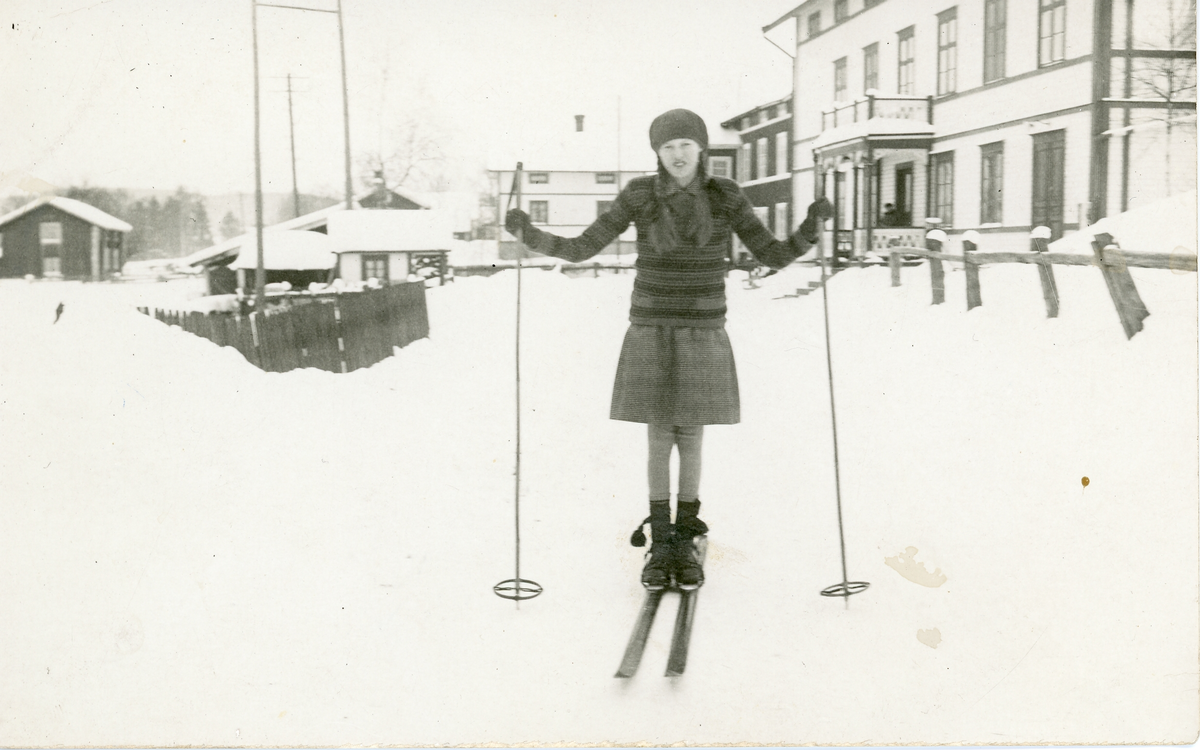 Titel: Foto på Linnea Jernberg, Lövstrand (liten by i Vilhelmina kommun), stående på skidor med hus i bakgrunden. Texten på baksida fotot- "min fina kompis, hon hade ibland röd-grön randiga strumpor, hon var jättebra".