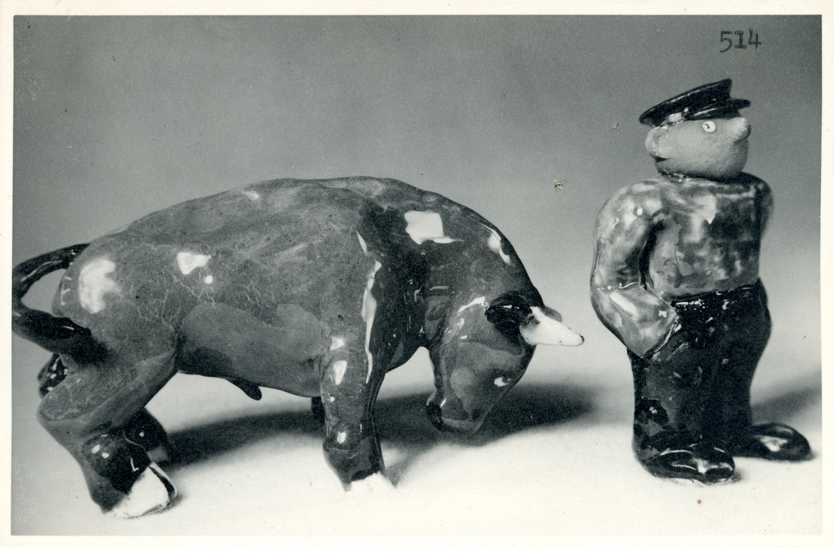 Keramikfigurer, Tjur (H6) och "Efraim" (H7), från Bo Fajans, 1900-talets mitt.