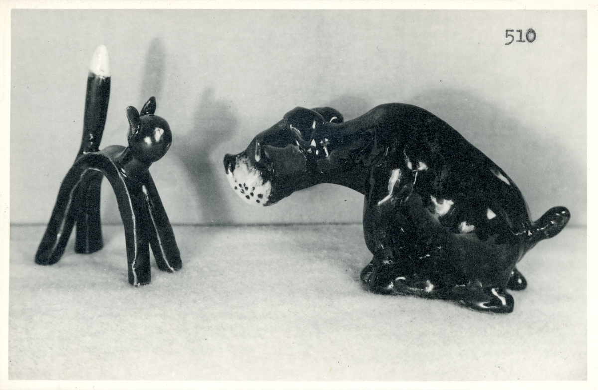 Keramikfigurer, Katt (H1) och Hund (H2), från Bo Fajans, 1900-talets mitt.