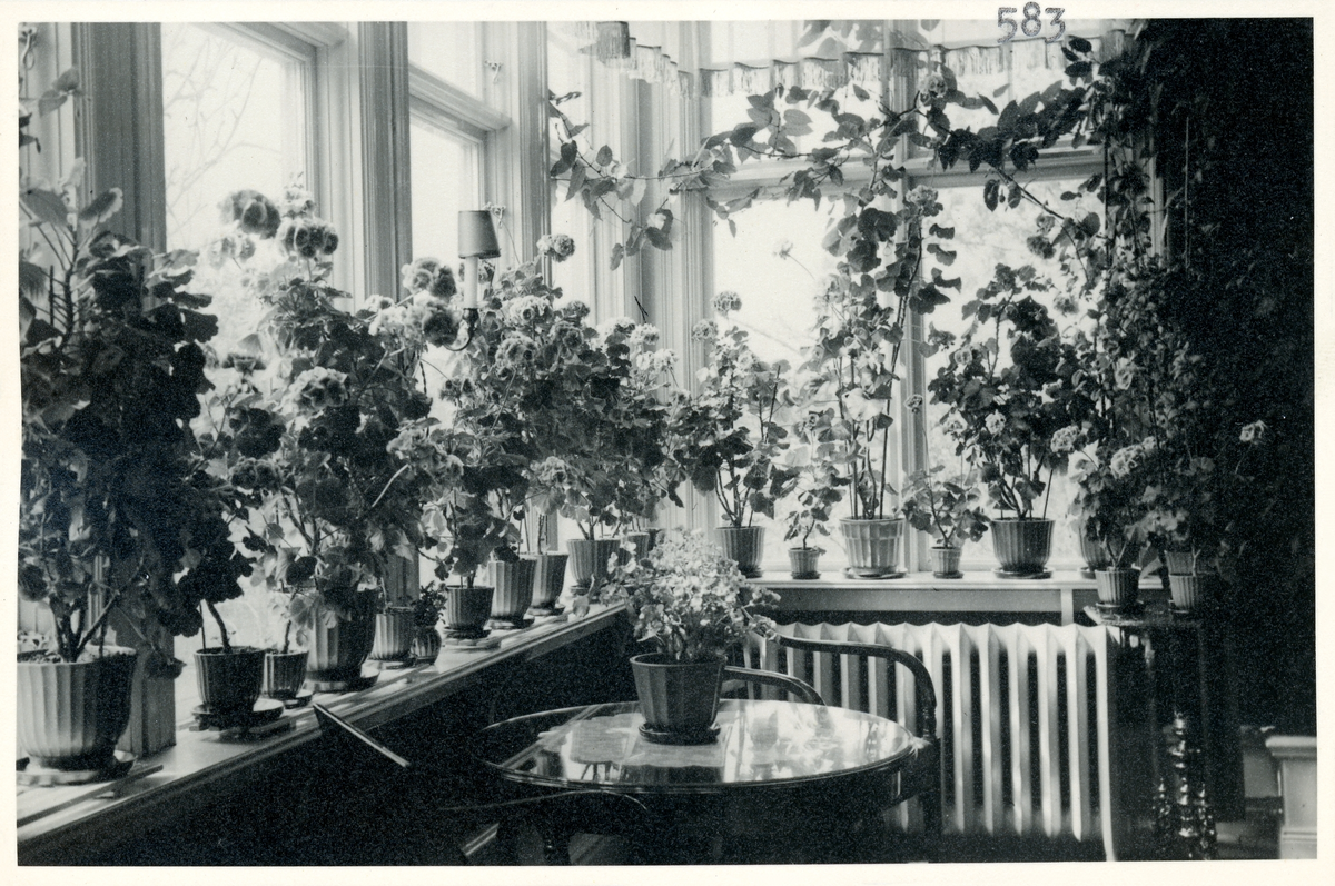 Orbis-krukor från Bo Fajans med växter i ett rum, formgivare Ewald Dahlskog, 1900-talets mitt.