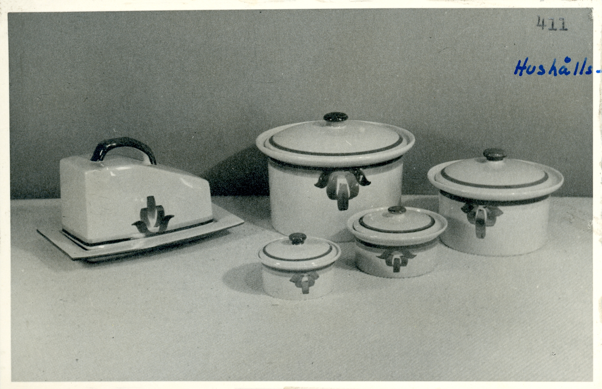 Hushållsgods från Bo Fajans. Ostkupa och karotter med lock. Dekor H.