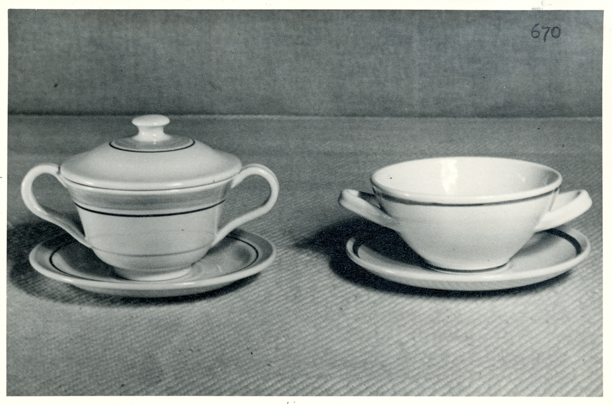 Ungsfast hushållsgods "Termo" från Bo Fajans, 1900-talets mitt. Skålar med lock och fat, den till vänster dekor "Viva".