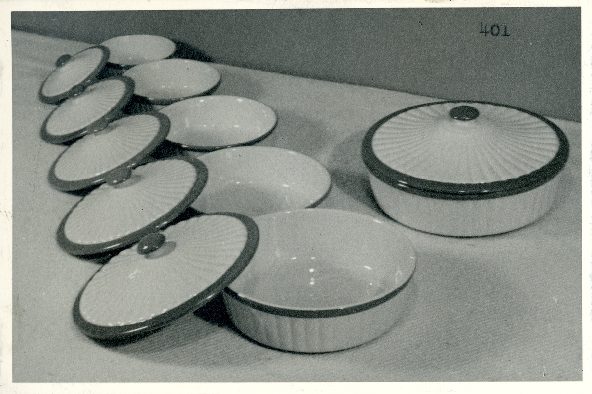 Karotter med lock, formgivare Allan Ebeling, tidigt 1900-tal. Gulaktig glasyr med gulbrun kant.