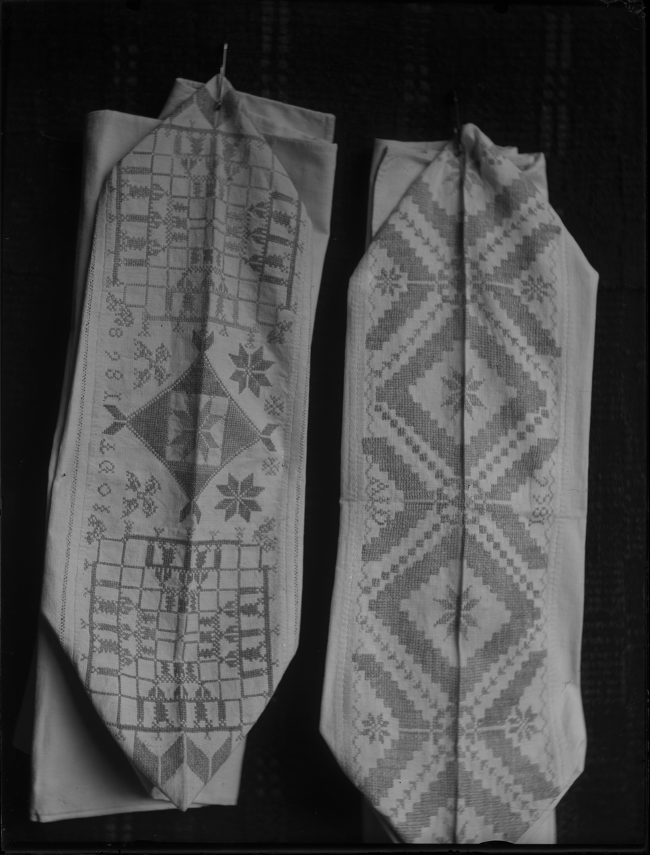Örngottshuvor i korssöm, den ena märkt "IODT 1868", den andra märkt "ALD 1886".