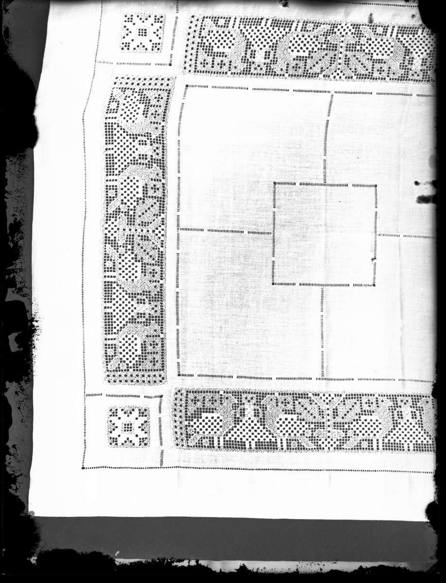 Linneduk med infällda spetsar i knutet och trätt, filébroderi.
