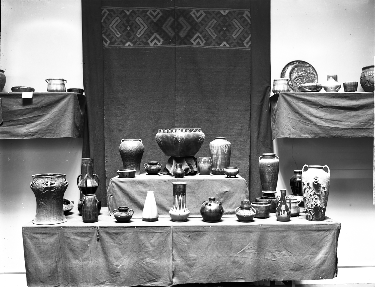 Utställning av keramikföremål, vaser, skålar, krukor och fat, i bakgrunden vävnad med bård i rölakan.