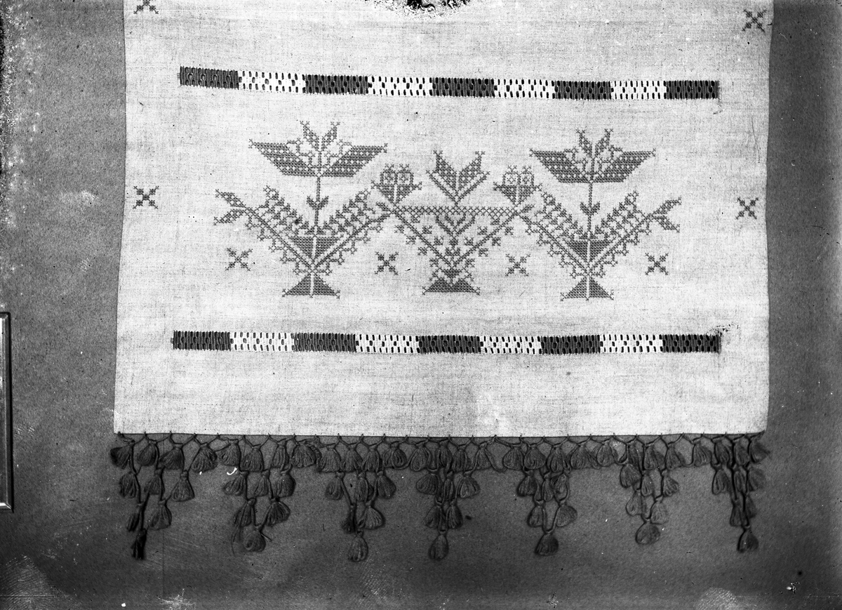 Broderi i korssöm och stopphålsöm, kläppfrans.