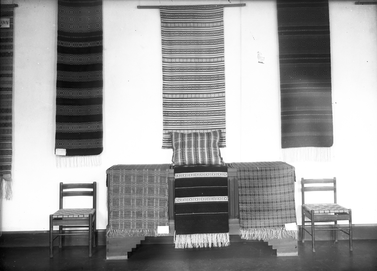 Utställning, vävnader i bl.a. hålkrus och munkabälte.