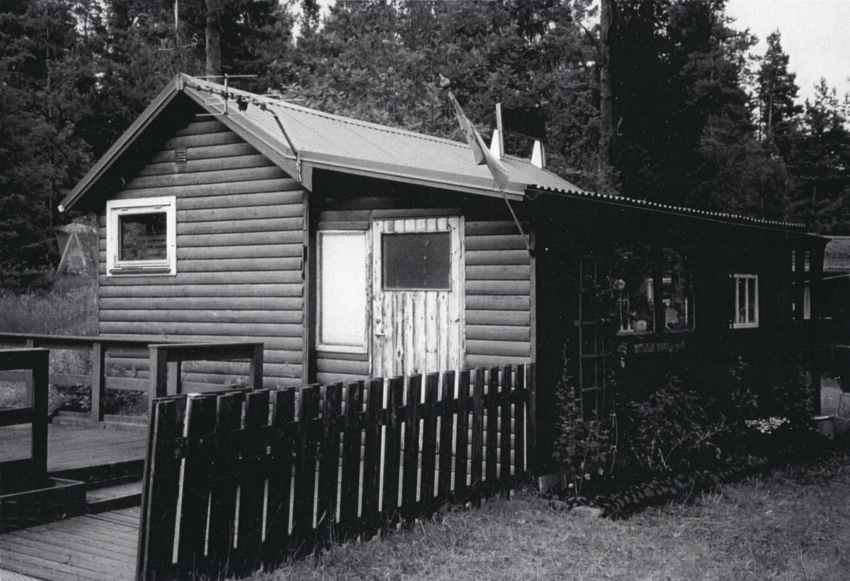 Åke Anderssons före detta stuga med en uteplats och mycket träd i bakgrunden.