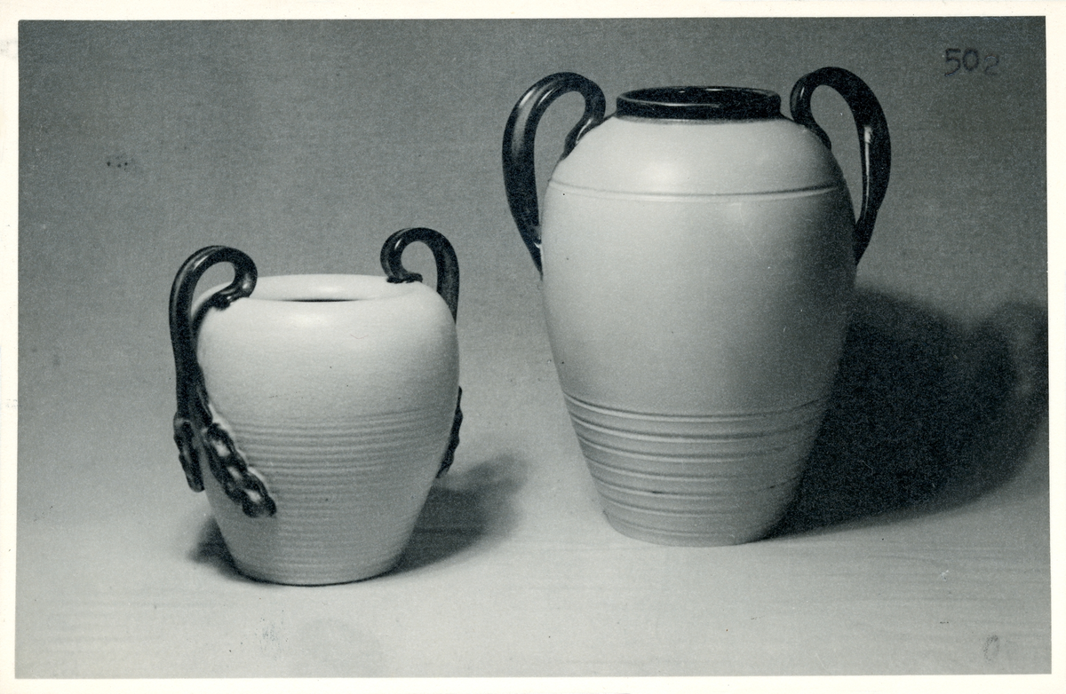 Vas B73 och B78 från Bo Fajans, formgivare Eva Jancke-Björk, 1900-talets mitt. Glasyr 510.