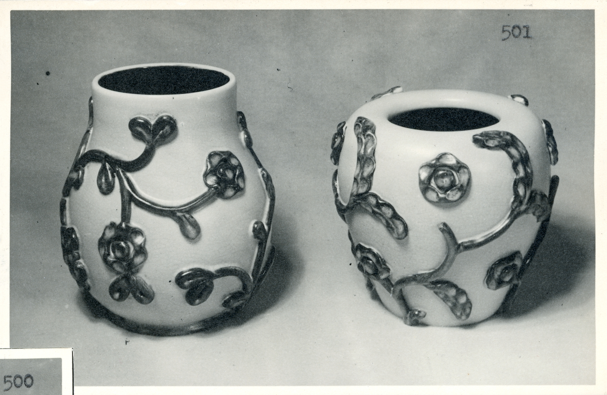 Vas B77 och B76 från Bo Fajans, formgivare Eva Jancke-Björk, 1900-talets mitt. Glasyr 510.
