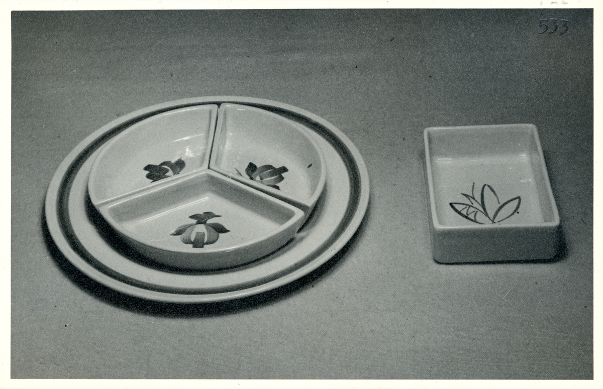 Skålar på bricka (1863 dekor H) och fyrkantig skål (1862 dekor M) från Bo Fajans, formgivare Eva Allan Ebeling, tidigt 1900-tal.