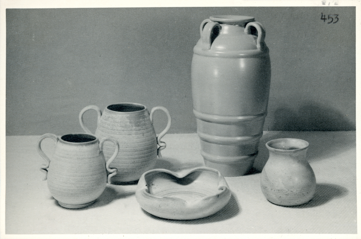 Vaser och ett askfat från Bo Fajans, formgivare Eva Jancke-Björk, 1900-talets mitt. Frost glasyr.