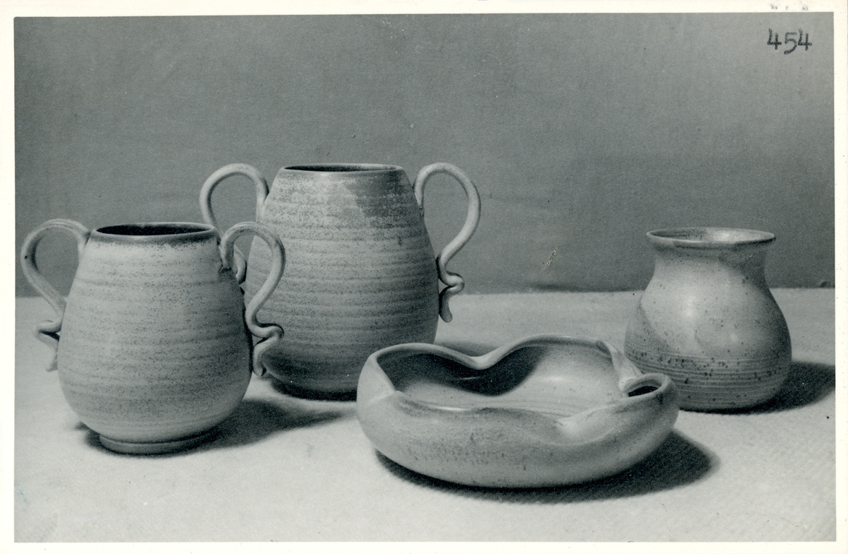 Vaser och askfat från Bo Fajans, formgivare Eva Jancke-Björk, 1900-talets mitt. Frost glasyr.